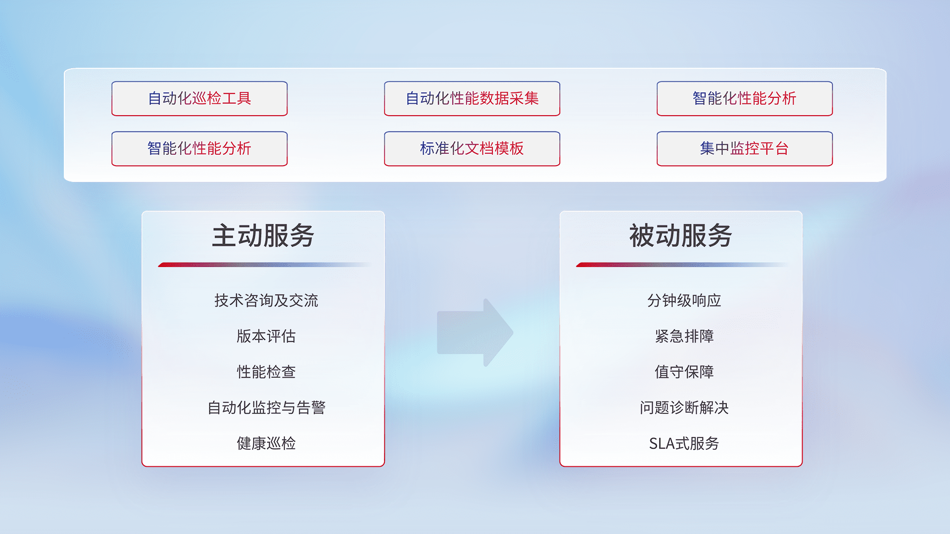 智能化工具和标准化文档,,,,保障服务质量,,,,提供主动服务(包含技术咨询、、、、版本评估、、、、性能检查、、自动化监控与告警、、、健康巡检)和被动服务包含(分钟级响应、、、、紧急排障、、、、值守保障、、、、问题诊断解决、、、SLA服务)。。。