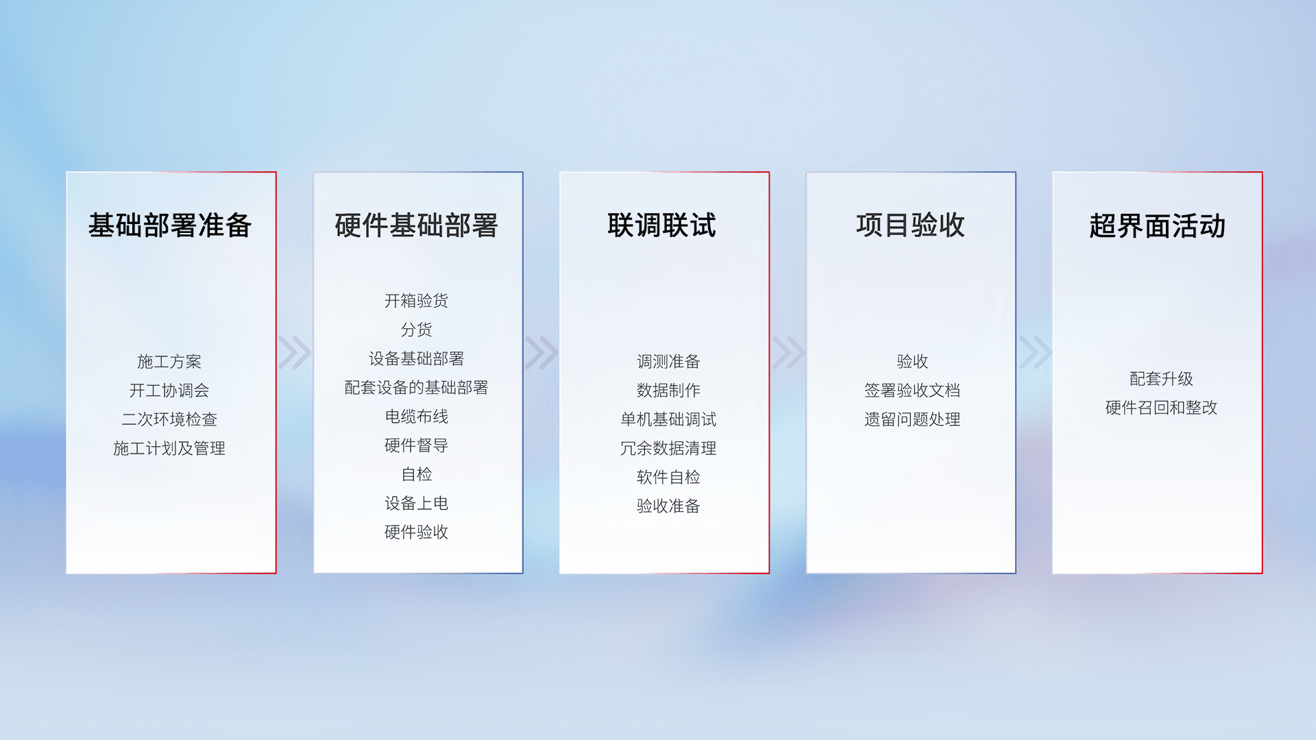 从基础部署准备、、、、硬件基础部署、、、联调联试、、、、项目验收、、、、越界面活动的全过程可追溯,,,,保证施工质量和进度。。